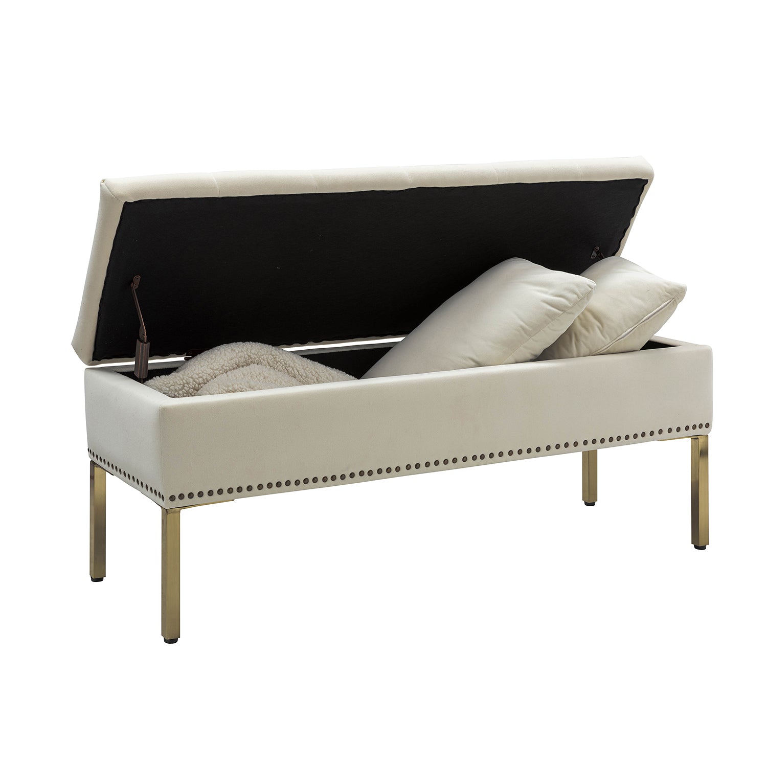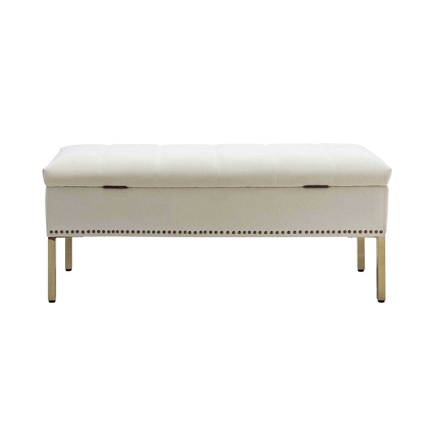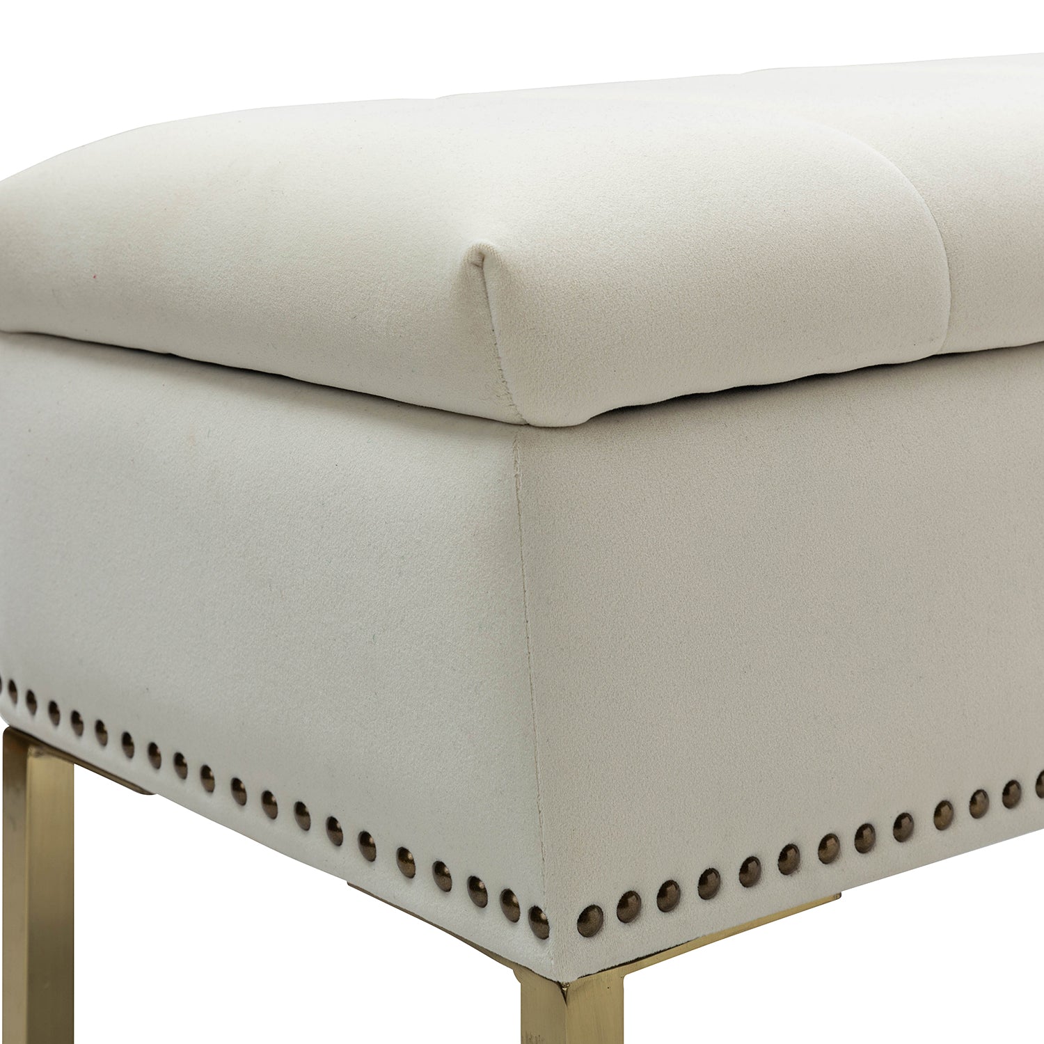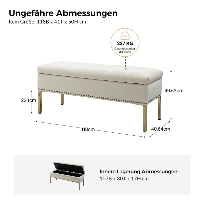 Die moderne Samt-Aufbewahrungsbank vereint Stil und Funktionalität und ist ein unverzichtbares Möbelstück für jedes Zuhause. Mit einem stabilen Rahmen, strapazierfähigem Polyesterstoff und weicher Schaumstoffpolsterung bietet sie außergewöhnlichen Komfort und Langlebigkeit. Das elegante, fünffach gesteppte Sitzkissen mit Nietenbesatz verleiht dem Design einen Hauch von Raffinesse. Dank der klappbaren Oberseite wird ein geräumiges Staufach sichtbar, ideal zum Organisieren von Alltagsgegenständen. Ob im Eingangsbereich, Wohnzimmer oder Schlafzimmer – diese vielseitige Bank passt perfekt zu traditionellem, Übergangs-, Vintage- und klassischem Dekor. Sie bietet nicht nur zusätzliche Sitzgelegenheiten, sondern auch eine praktische Aufbewahrungslösung, die Stil und Komfort vereint.