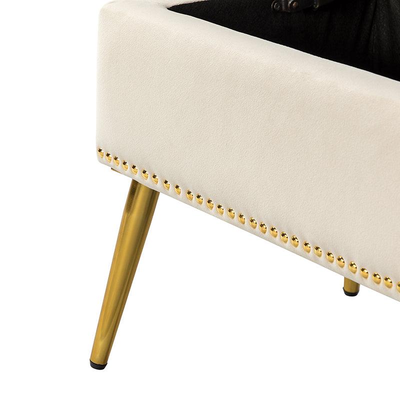 Ich liebe die Bank. Es ist robust und leicht zusammenzustellen. Die Frühlingsscharniere scheinen von guter Qualität zu sein. Etwas enttäuscht von der Farbe der Beine. Mehr orangefarbene Messingfarbe als ich erwartet hatte. Aber es ist kein Biggie !! Ich mag die Bank immer noch sehr. Das Samt ist auch von anständiger Qualität.