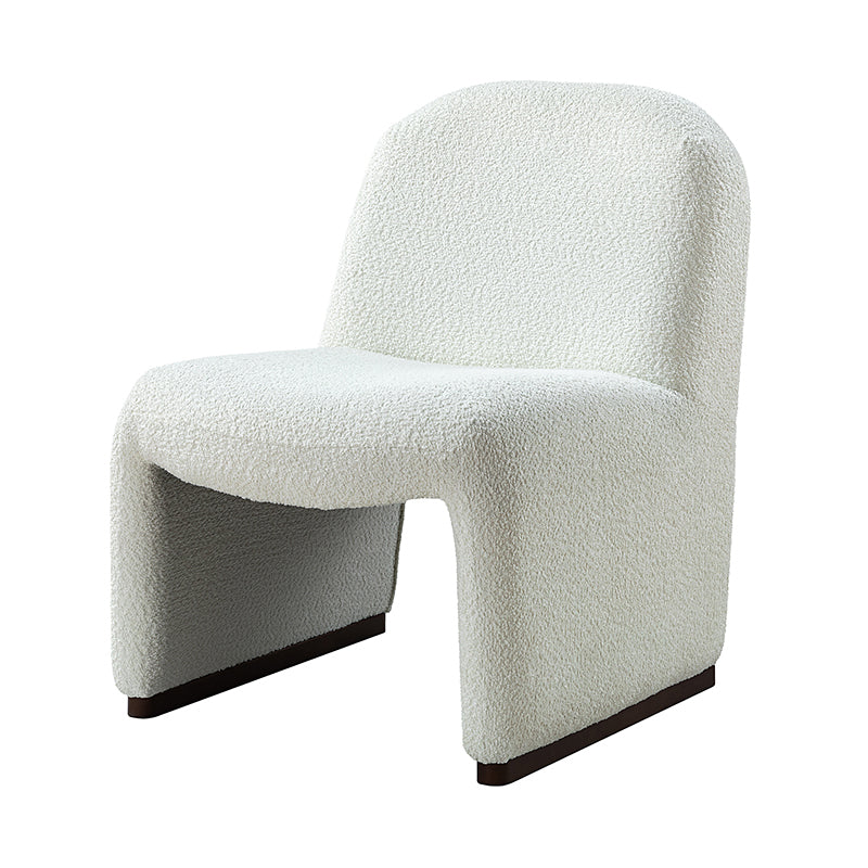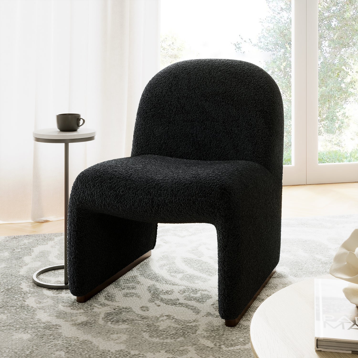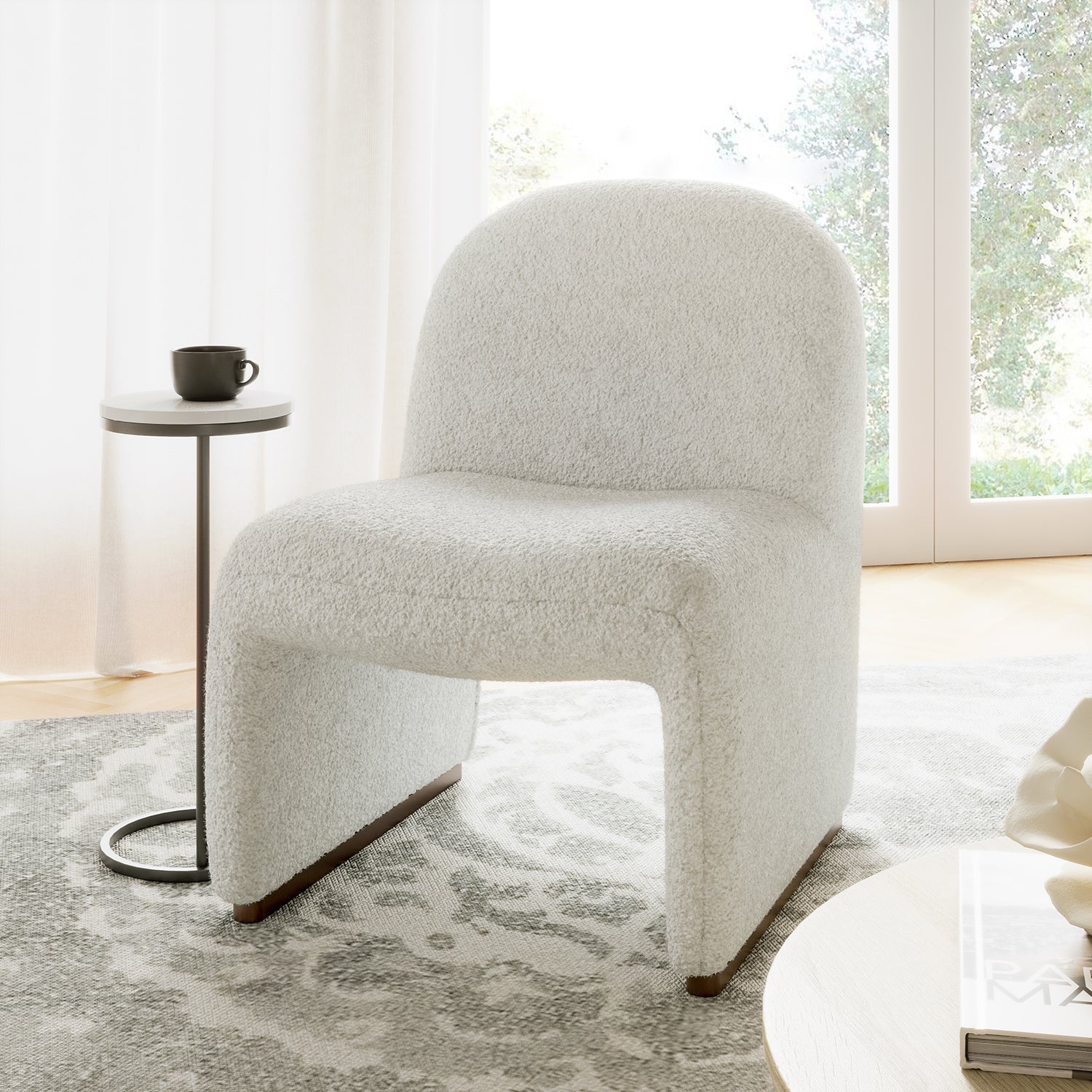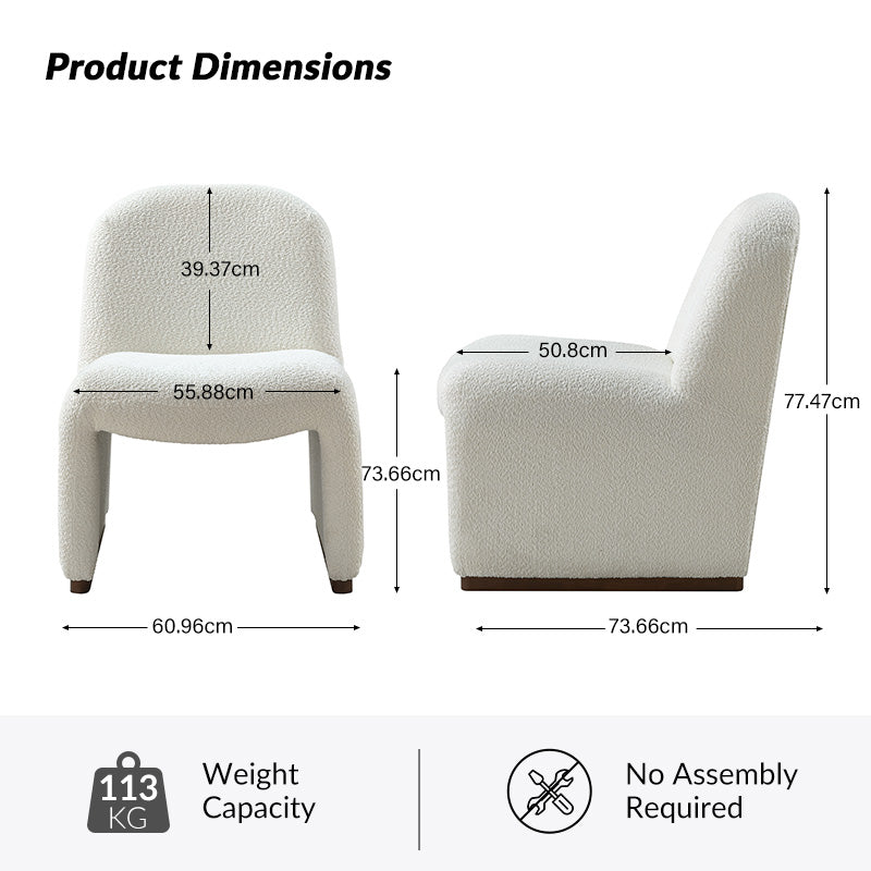 Dieser stromlinienförmige Beistellstuhl besticht durch eine elegante Silhouette mit geschwungener Sitzfläche, vereinfachtem Profil und weichen Kurven und ist das beste Statement des modernen Updates. Er ist von den Füßen bis zur Rückseite des Mid-Century-Akzentstuhls mit einem wunderschönen Bouclé-Stoff gepolstert und lädt zum Verweilen ein. Der bogenförmige Sitz ruht auf Hartholzbeinen mit einer verführerischen handgefertigten Nussbaumoberfläche und entlastet nach und nach den Hüftdruck von der Mitte zu den Seiten. Der einzigartige Beistellstuhl strahlt müheloses Aussehen und Funktion aus und verbindet nahtlos den Komfort von Bouclé mit einem ergonomischen Design. Dieser Beistellstuhl bietet maximale Sitzgelegenheiten auf minimalem Raum und ist somit eine vielseitige Ergänzung für verschiedene Bereiche wie Ihr Wohnzimmer, Schlafzimmer, Büro oder Arbeitszimmer. Ganz gleich, ob Sie ihn neben ein Sofa stellen oder ihn mit einer Ottomane kombinieren, er verleiht Ihrer Inneneinrichtung mühelos Glamour und einen Hauch von Bohème-Flair. Darüber hinaus können Sie den Komfort genießen, sich keine Gedanken über den Zusammenbau machen zu müssen, da dieser Stuhl mit seinem Boho-Ästhetik- und Funktionsdesign Ihren Raum verschönert.