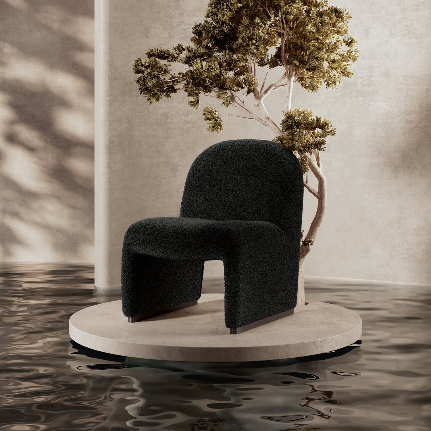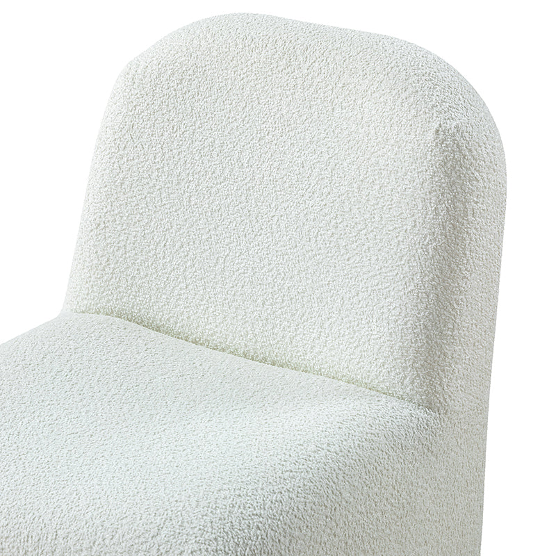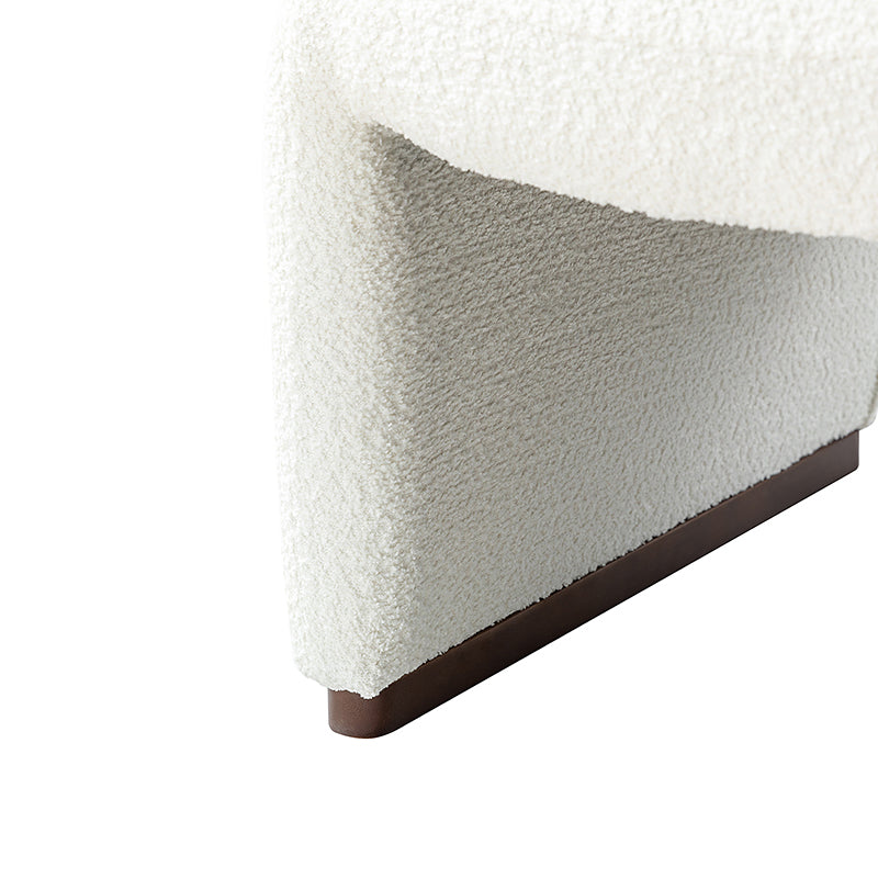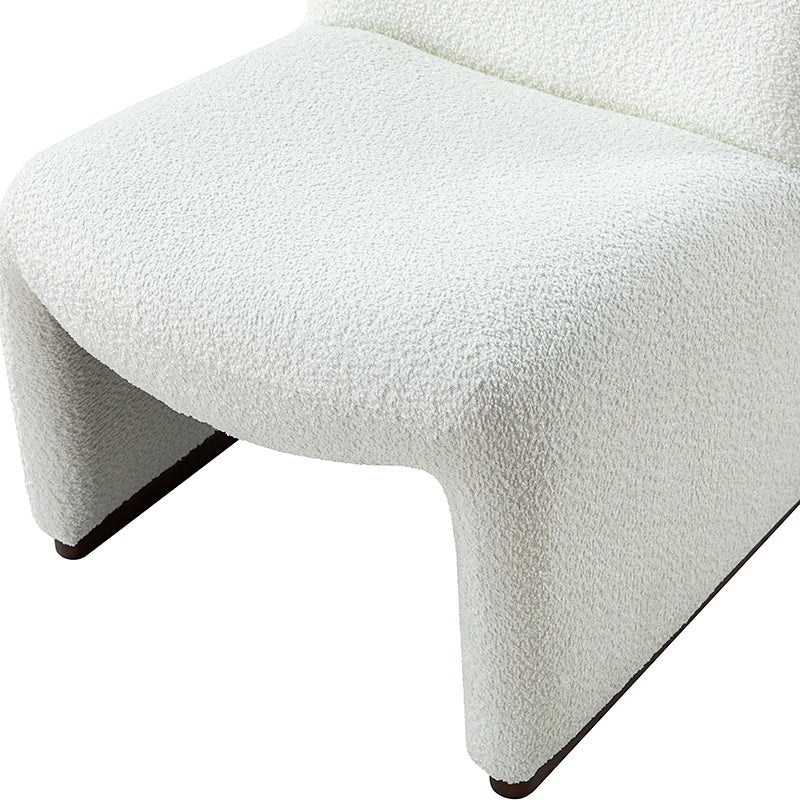 Dieser stromlinienförmige Beistellstuhl besticht durch eine elegante Silhouette mit geschwungener Sitzfläche, vereinfachtem Profil und weichen Kurven und ist das beste Statement des modernen Updates. Er ist von den Füßen bis zur Rückseite des Mid-Century-Akzentstuhls mit einem wunderschönen Bouclé-Stoff gepolstert und lädt zum Verweilen ein. Der bogenförmige Sitz ruht auf Hartholzbeinen mit einer verführerischen handgefertigten Nussbaumoberfläche und entlastet nach und nach den Hüftdruck von der Mitte zu den Seiten. Der einzigartige Beistellstuhl strahlt müheloses Aussehen und Funktion aus und verbindet nahtlos den Komfort von Bouclé mit einem ergonomischen Design. Dieser Beistellstuhl bietet maximale Sitzgelegenheiten auf minimalem Raum und ist somit eine vielseitige Ergänzung für verschiedene Bereiche wie Ihr Wohnzimmer, Schlafzimmer, Büro oder Arbeitszimmer. Ganz gleich, ob Sie ihn neben ein Sofa stellen oder ihn mit einer Ottomane kombinieren, er verleiht Ihrer Inneneinrichtung mühelos Glamour und einen Hauch von Bohème-Flair. Darüber hinaus können Sie den Komfort genießen, sich keine Gedanken über den Zusammenbau machen zu müssen, da dieser Stuhl mit seinem Boho-Ästhetik- und Funktionsdesign Ihren Raum verschönert.
