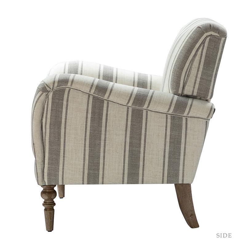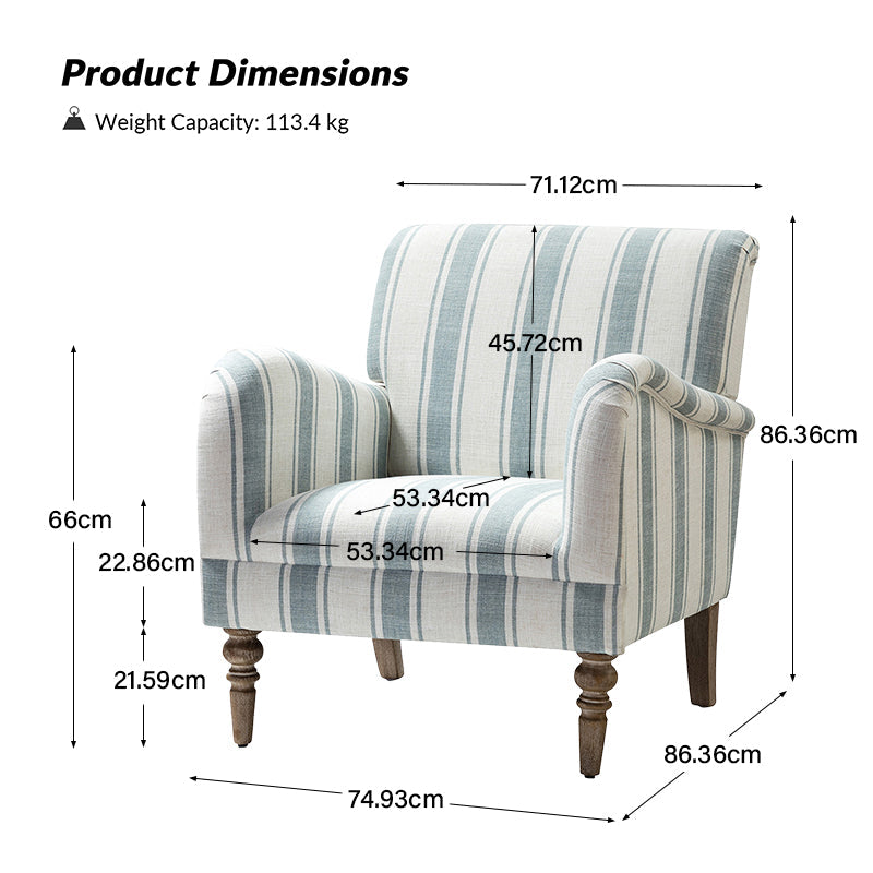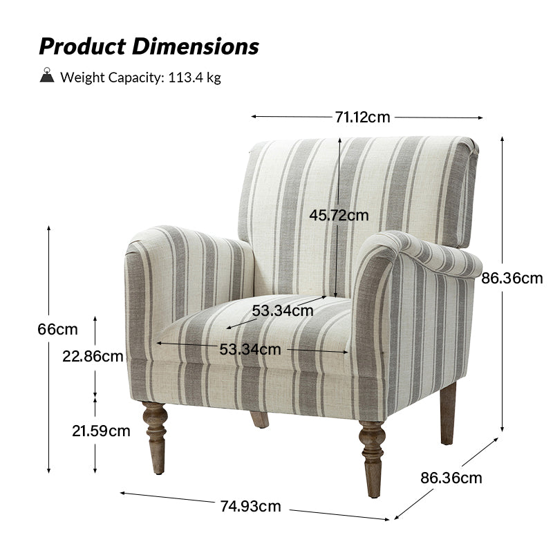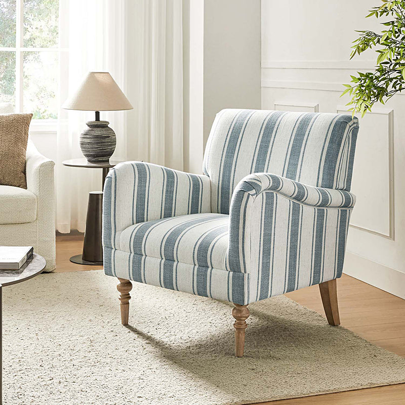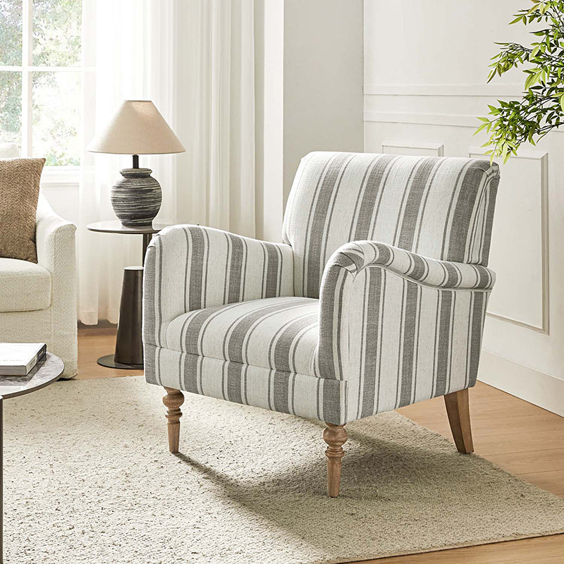 Sie suchen einen Akzentstuhl für Ihr Wohn- oder Schlafzimmer? Dieser Stuhl passt zu Ihrem glamourösen Lebensstil und verleiht Ihrem Raum einen auffälligen Touch. Er ist ein klassischer und moderner Akzentstuhl mit leicht schräger Rückenlehne, integrierten Armlehnen und Retro-Füßen. Er ist aus hochwertigem, hautfreundlichem Stoff aus 100 % Polyester gefertigt und verfügt über ein trendiges Streifenmuster, das sich garantiert in Ihr Farbschema einfügt. Die Schaumstofffüllung mit hoher Dichte und der Rahmen aus massivem und verarbeitetem Holz sorgen für Komfort und Halt. Die gedrechselten Beine im Retro-Stil und die sich verjüngenden Blockbeine verleihen diesem Möbelstück ein antikes Design und tragen zu seiner zeitlosen Mode bei. Es ist die perfekte Wahl für Wohnzimmer, Büro und Schlafzimmer.